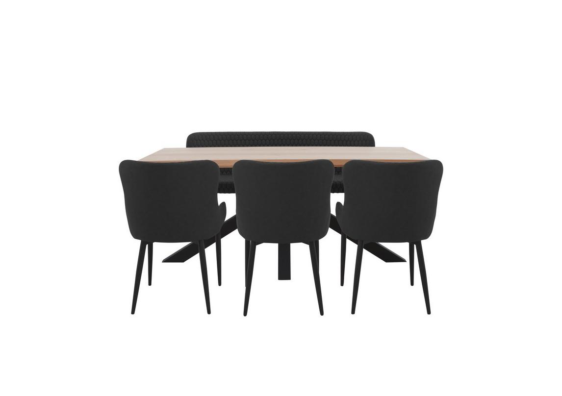 A rectangular tabletop, a rectangular bench seat, square seats of chairs are in mid browns.